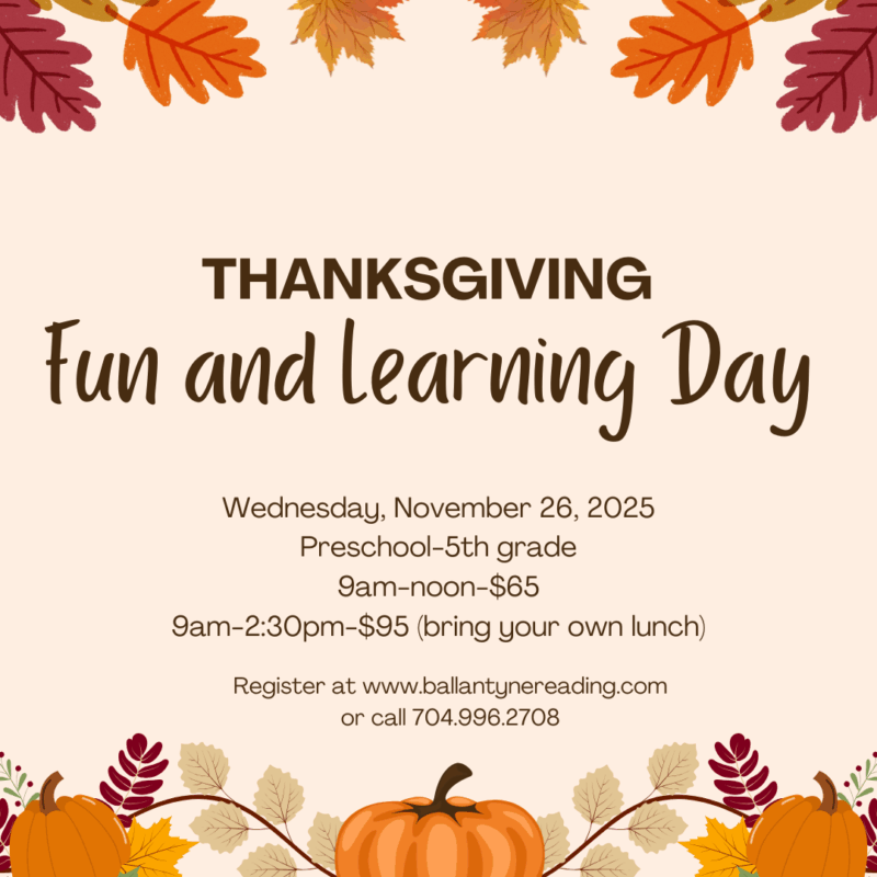 Just because school is out does not mean the fun and learning has to stop! This holiday season Ballantyne Reading Academy will be offering “mini camps” December 27-29. Like our summer camps, these holiday camps will provide literature-based activities, games, storytelling, and songs with hands-on materials to expand pre-reading, reading and language skills.